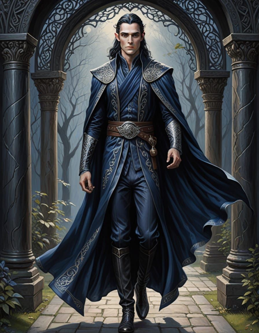 A striking picture of a handsome, androgynous, hairless elf in a high fantasy setting. The elf, with indigo eyes and long black hair, is depicted in an elegant elven style.