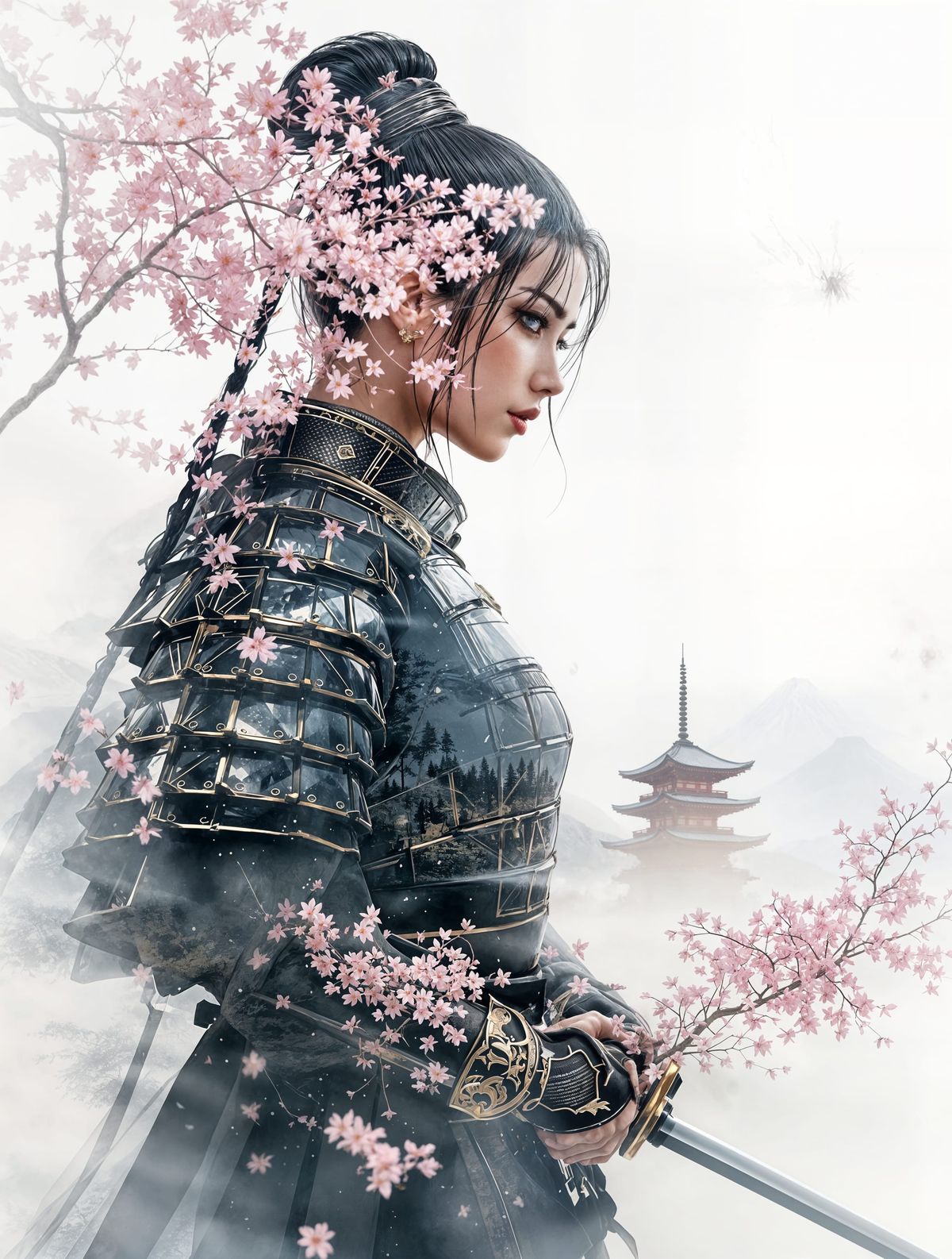 A serene female samurai warrior stands poised amidst a tranquil Japanese landscape, with delicate pink cherry blossoms and a misty forest blending harmoniously with her traditional armor and katana.