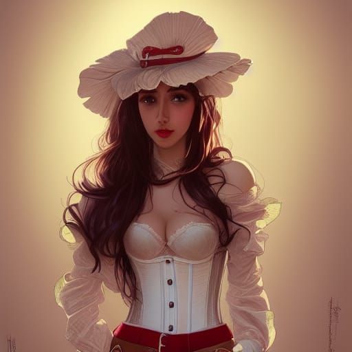 A hyperdetailed portrait of a woman wearing a tight corset with a mushroom pattern. This dynamic splash art features intricate details, triadic colors and volumetric lighting.