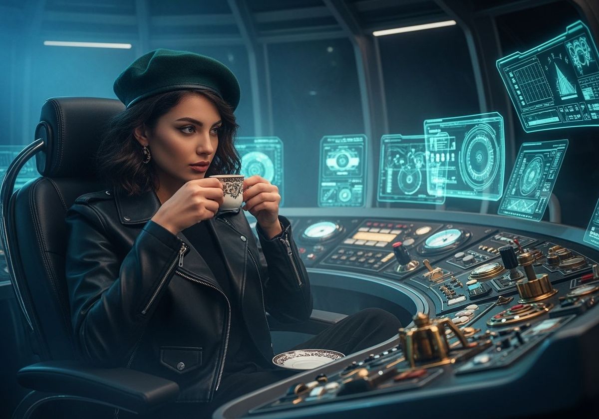 This image shows a stylish young woman enjoying coffee inside a steampunk-inspired time machine. The scene is lit with cinematic lighting and features photorealistic textures in deep blues, greens, and browns.