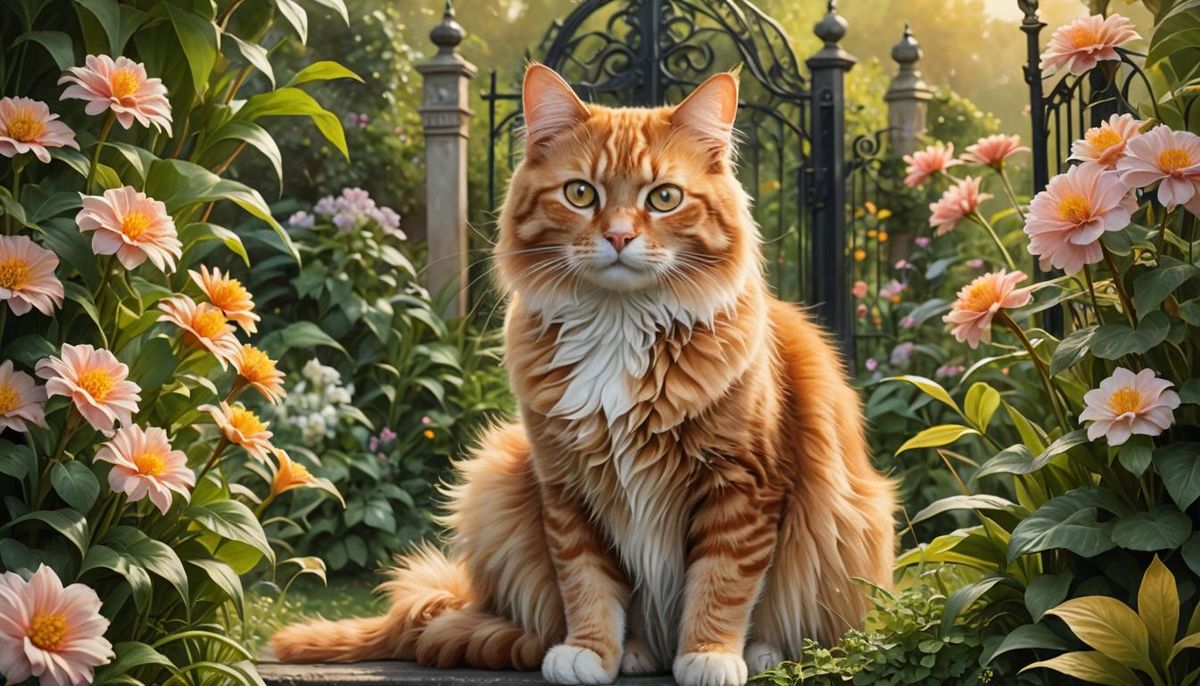 A hyperrealistic digital painting of a ginger cat in a garden. Rendered with soft focus, the image features warm sunlit mist and intricate golden patterns in a dreamy art deco style.