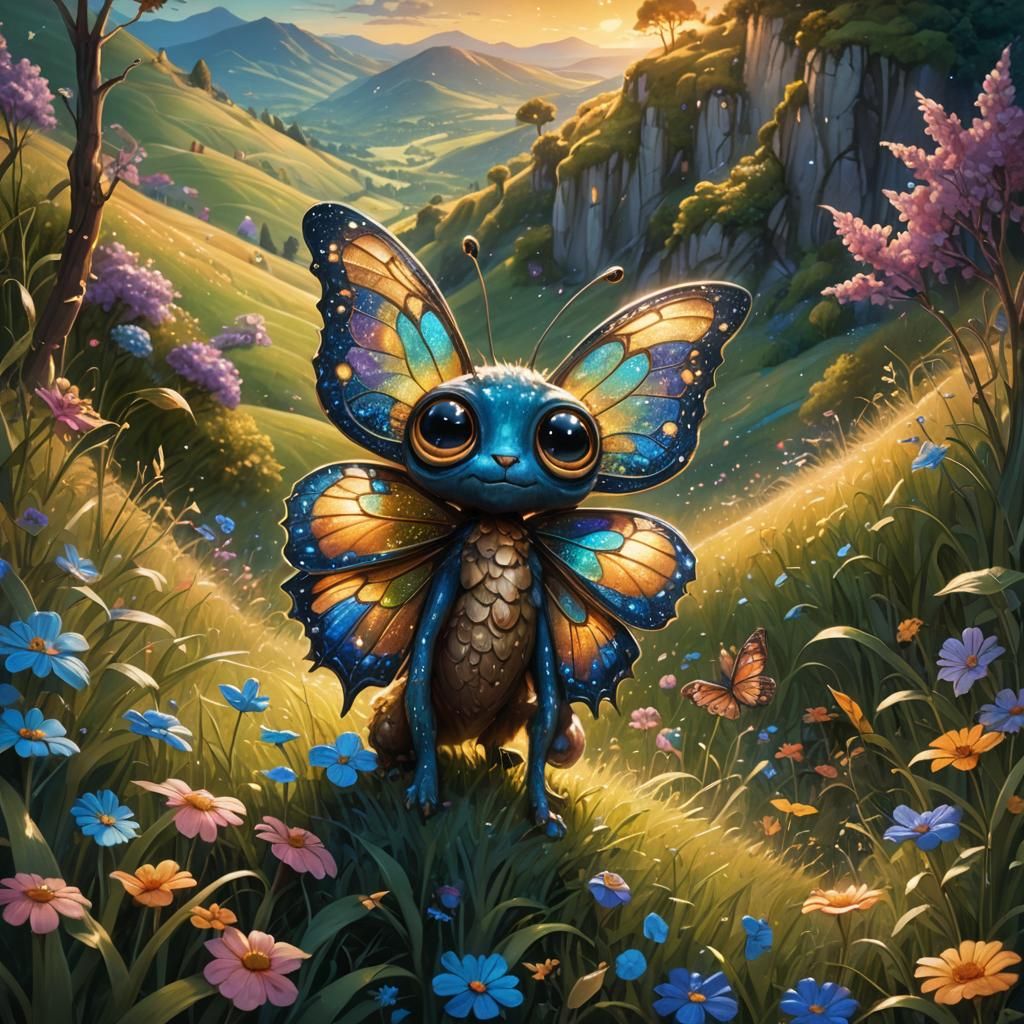 This image shows a cute, big-eyed creature with butterfly wings standing in a glitter-filled, shady fantasy landscape. The creature's wings catch warm light in this vibrant matte painting with deep blues and oranges.