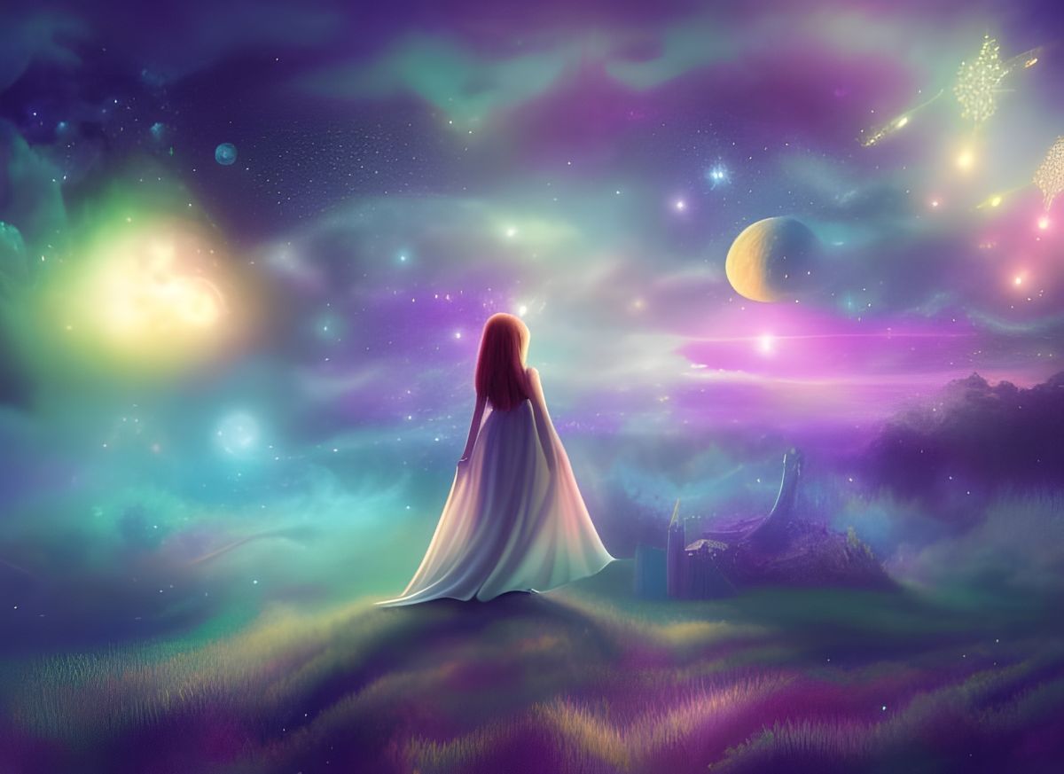 A digital painting shows a twilight landscape filled with iridescent sparkles and fairy dust against an outer space backdrop of stars and moons. This cinematic artwork is rendered with volumetric lighting.
