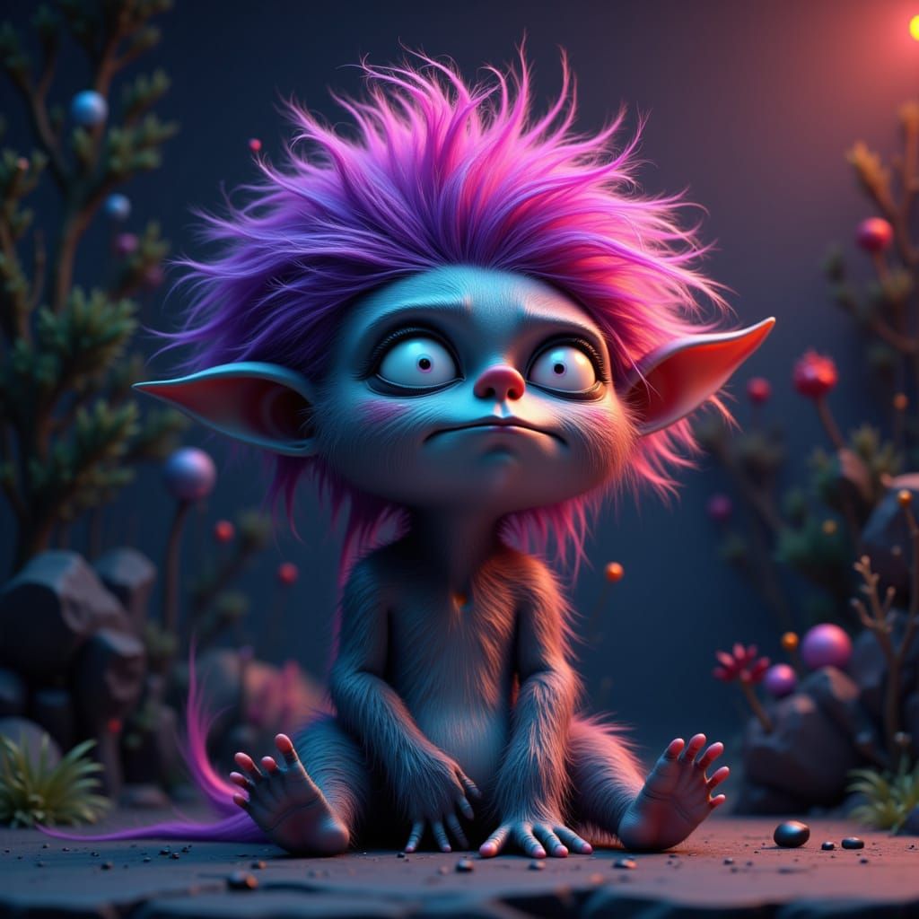This image shows a sulky, hairy baby monster in time out. The CGI cartoon art features intricate details, deep color, and complementary colors as a detailed matte painting.