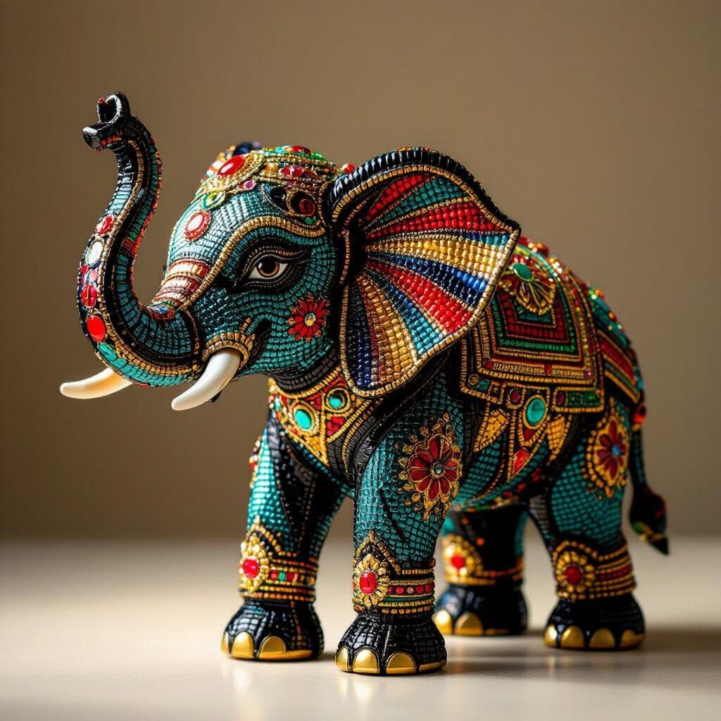 This image shows a handcrafted beaded elephant sculpture adorned with colorful glass beads. The intricate patterns in red, turquoise, gold, and black create a shimmering texture in soft lighting.