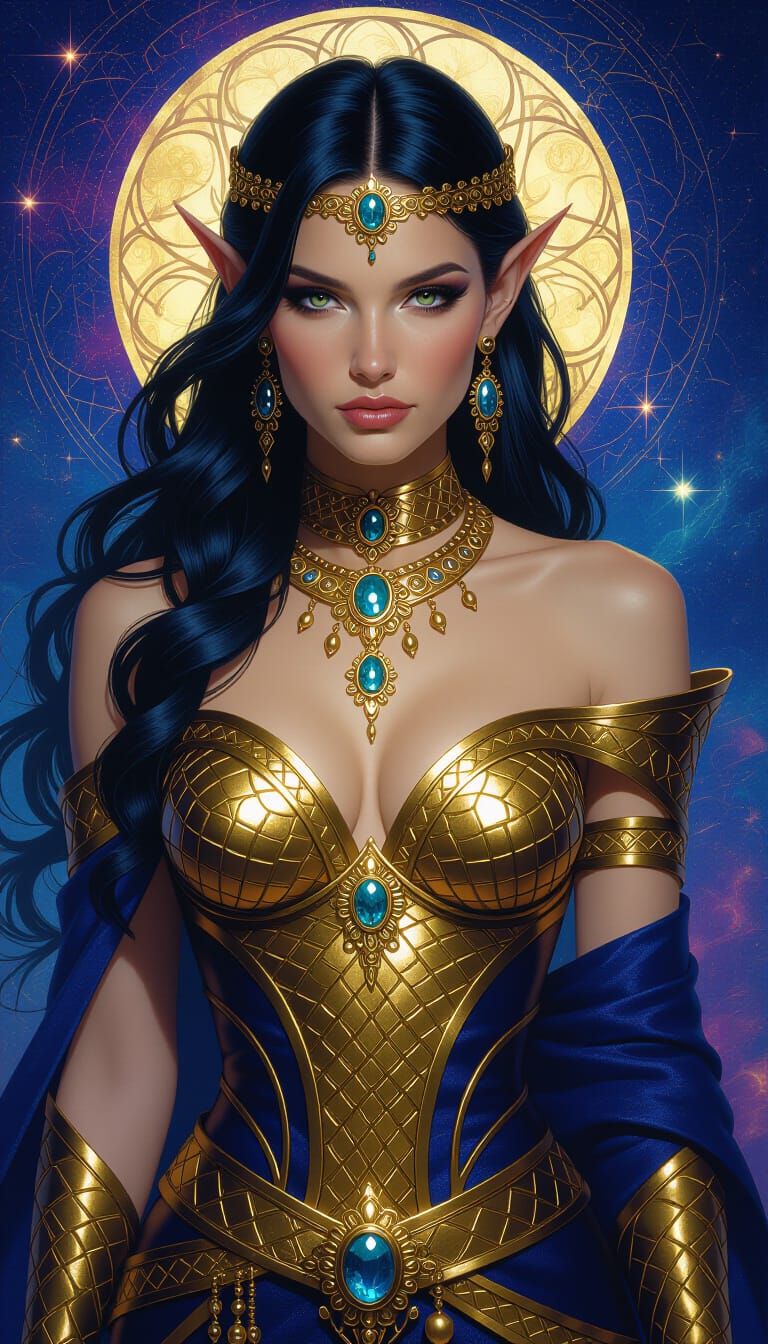A striking picture of a snake-elf hybrid woman wearing gold. The character is set against a cosmic background with dramatic lighting, rendered with cinematic and psychedelic elements. The image features rich, vibrant colors.