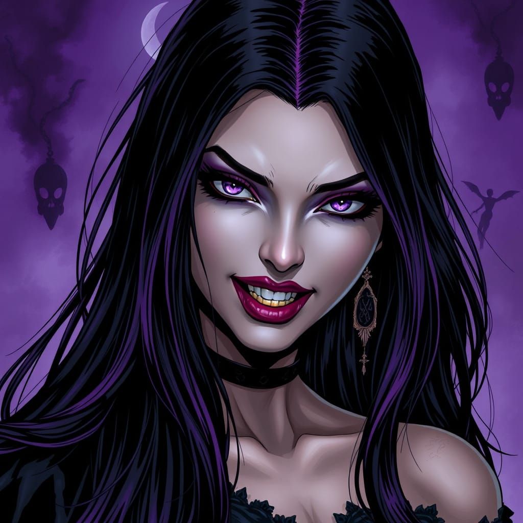 A striking picture of a gothic vampire with long black hair and purple highlights. The vampire has gold teeth and piercing purple eyes, enhanced by dramatic eye shadow, in a hyper-realistic comic style.