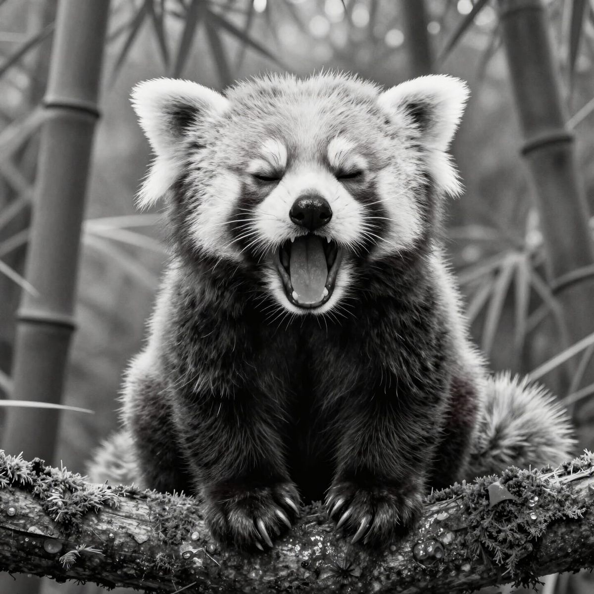 This highly detailed graphite pencil drawing captures an irresistible red panda cub yawning. The extreme close-up showcases its fluffy fur, distinct markings, and sleepy expression with tiny teeth visible.