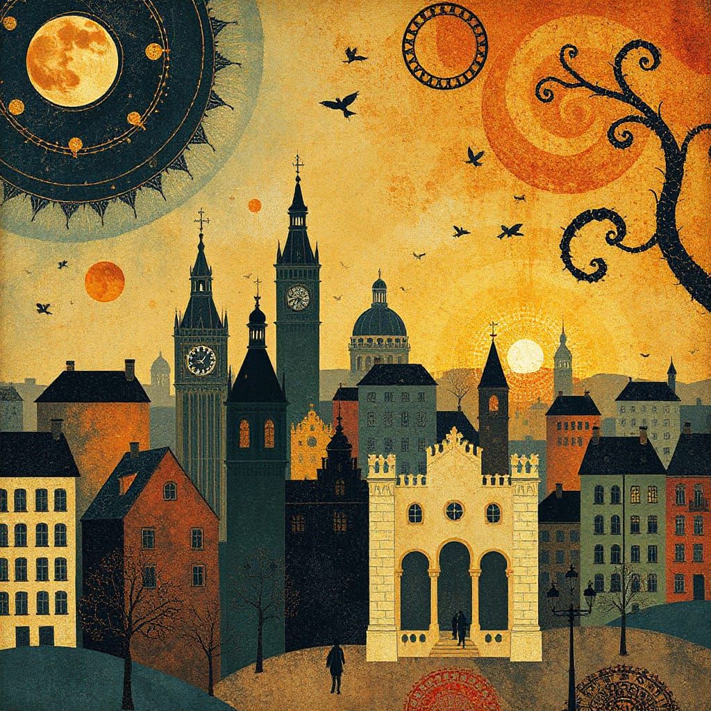 Unleash your creativity with our free AI image generator, perfect for creating unique Dark Folk Art and Art Nouveau-inspired cityscapes.