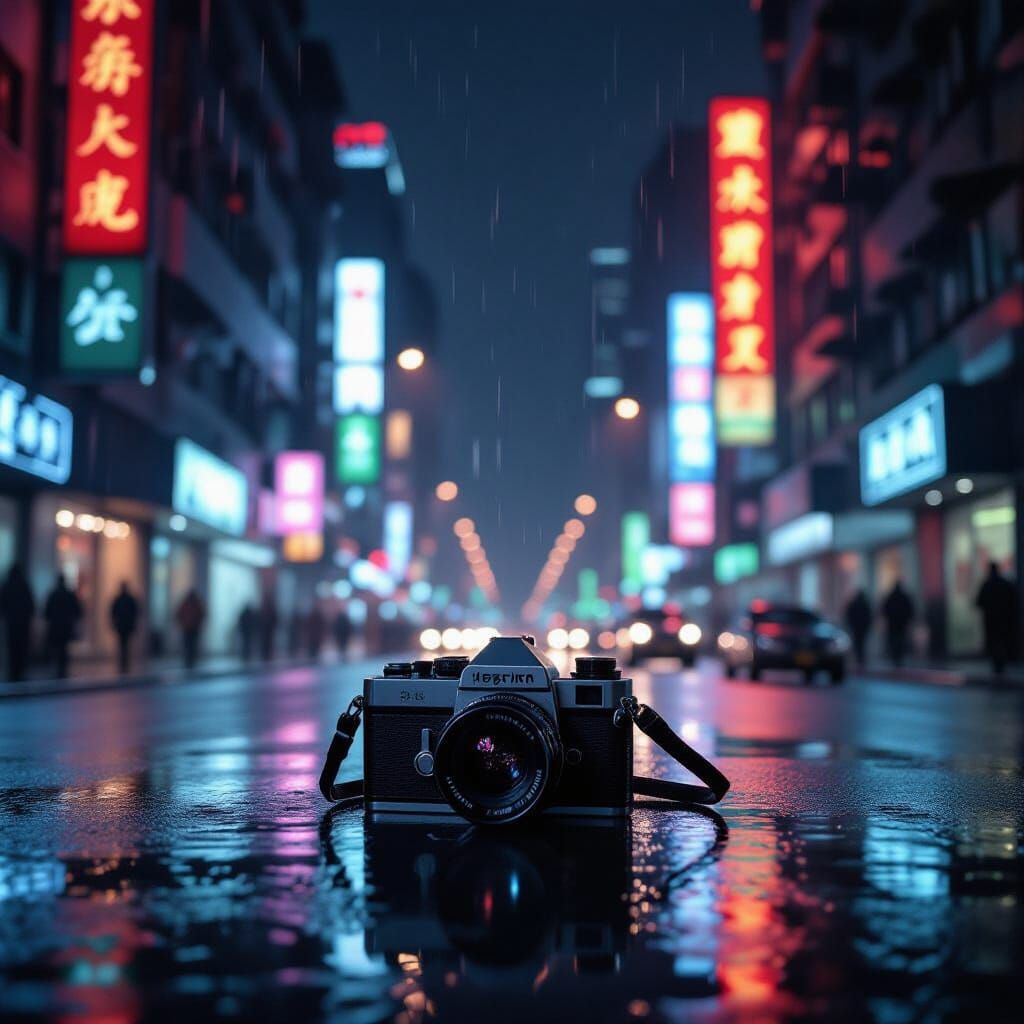 A vintage-style photograph captures a rainy city night scene. Neon signs cast hazy reflections on the wet streets, creating a dreamlike atmosphere with soft focus, film grain, and light leaks. The image evokes nostalgia.
