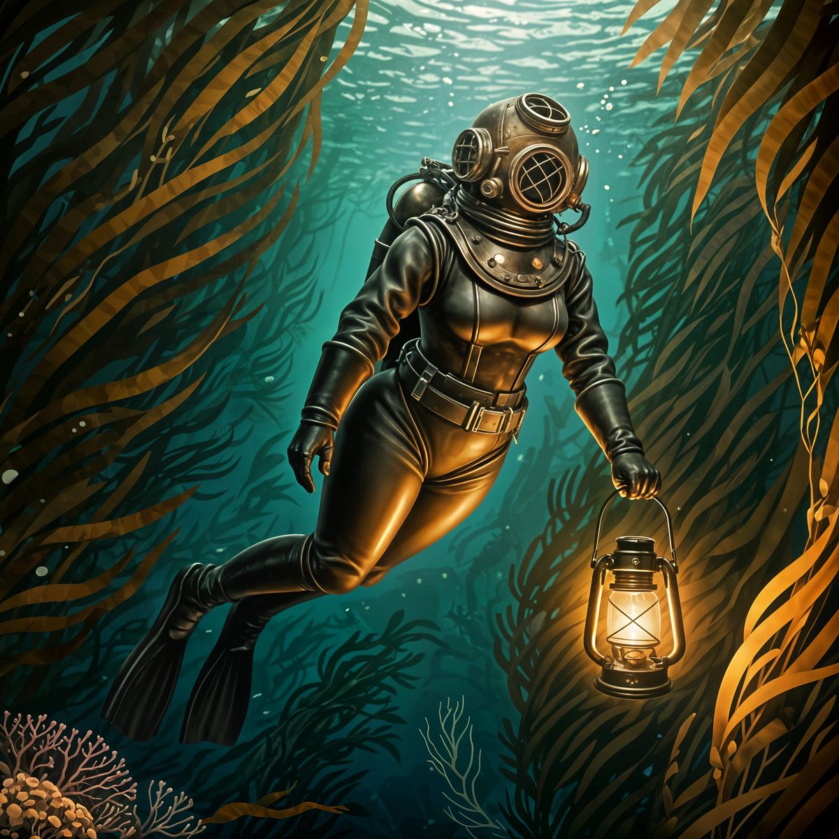 Easily create your own steampunk diver images with our free AI image generator, featuring victorian-inspired characters in underwater scenes.