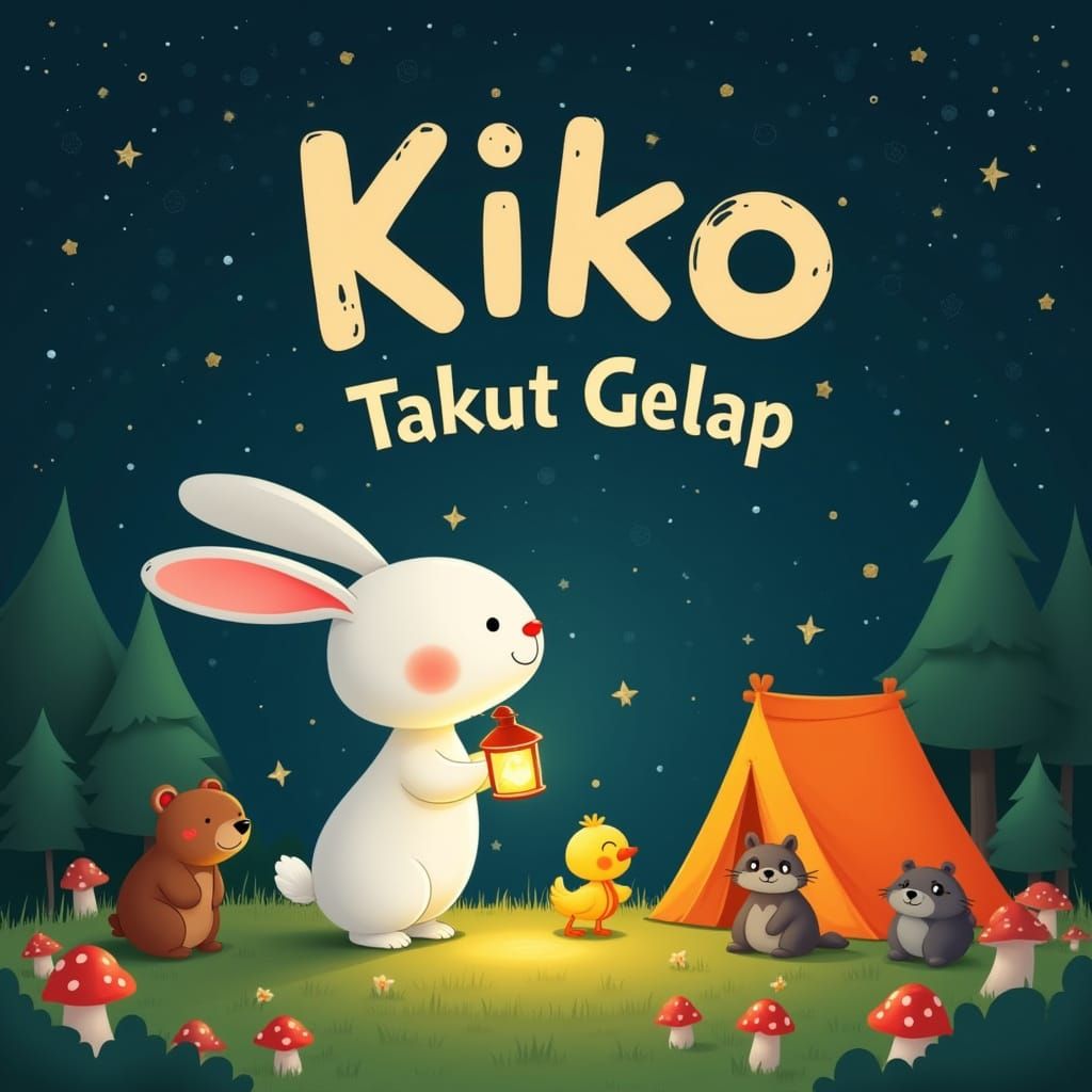 This image shows a cute white rabbit, Kiko, holding a lantern and looking at a starry sky. Forest friends surround a tent in this warm 2D illustration.