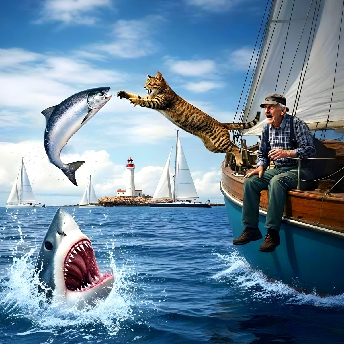 This image captures a dynamic white blur streak, suggesting rapid motion. It hints at a playful scene involving a cat, a sailboat, fish, and a shark.