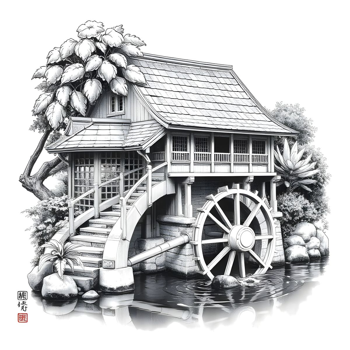 This serene image depicts a traditional Japanese waterwheel and house amidst lush greenery, rendered in intricate black and white ink drawing style, evoking a sense of stillness and contemplation.