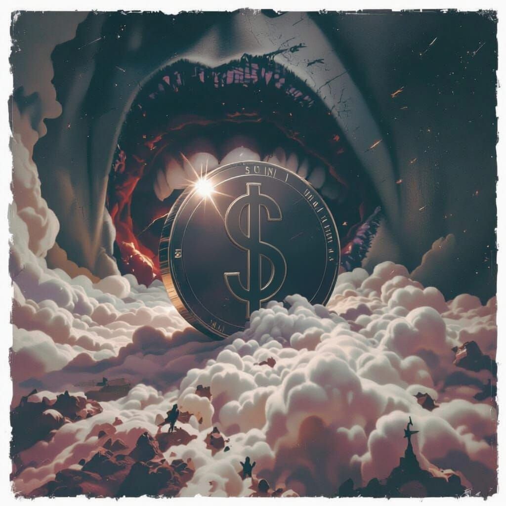 An apocalyptic image depicts a communion host transformed into a coin, with a greedy mouth in the background poised to consume it.