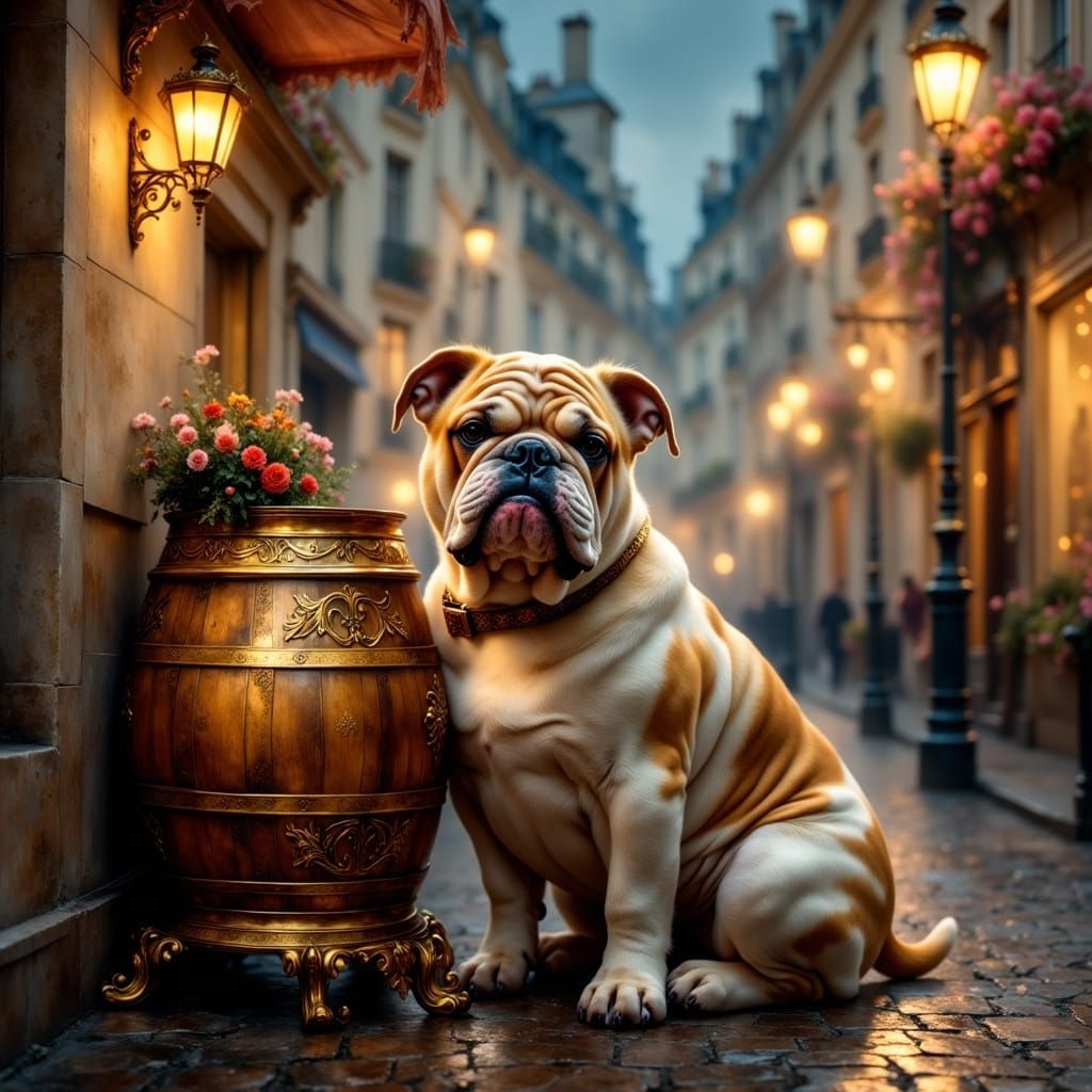This image shows a lilac English bulldog in Paris listening to music from an intricately carved barrel organ. The scene is set at night with soft lighting, creating a dreamlike atmosphere.