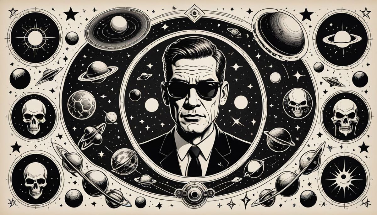 This image shows a traditional tattoo flash sheet with a Men in Black theme. The black ink artwork features UFOs, agents, aliens, and sci-fi elements in a 1950s aesthetic.