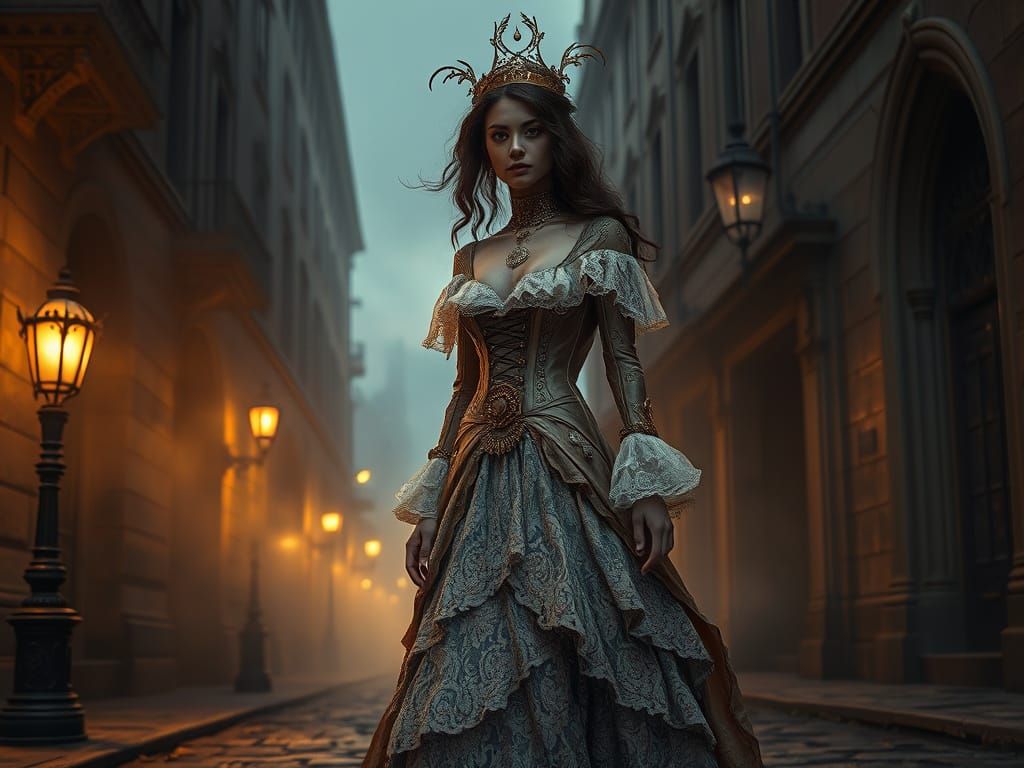 This image shows a stunning steampunk vampire princess walking into a fog-shrouded street, surrounded by Gothic architecture and old gas lamps, in a beautifully detailed, intricately layered dress with brass gears and copper accents, blending industrial and Victorian era aesthetics in a rich, hyper-reali...