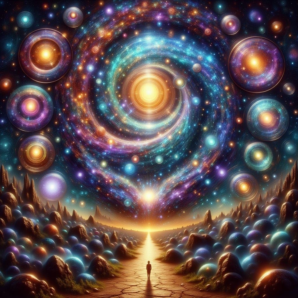This image shows a surrealist scene of a figure at a cosmic crossroads, surrounded by shimmering portals reflecting different worlds. Rendered with bold colors and dreamlike imagery.