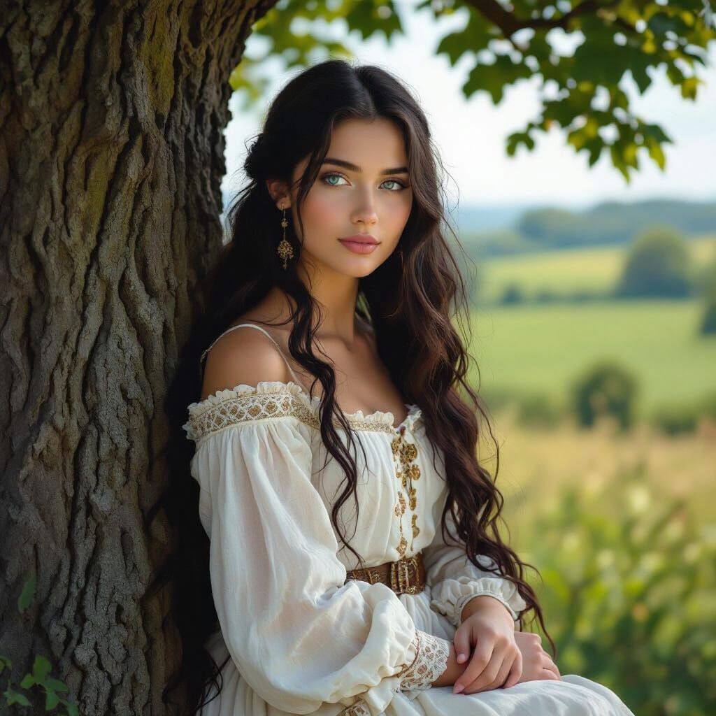 This image shows a beautiful, fair maiden with long raven hair and striking blue eyes in a medieval-style portrait. She wears a Celtic-patterned dress in a rural scene, rendered with fine details and a romantic atmosphere.