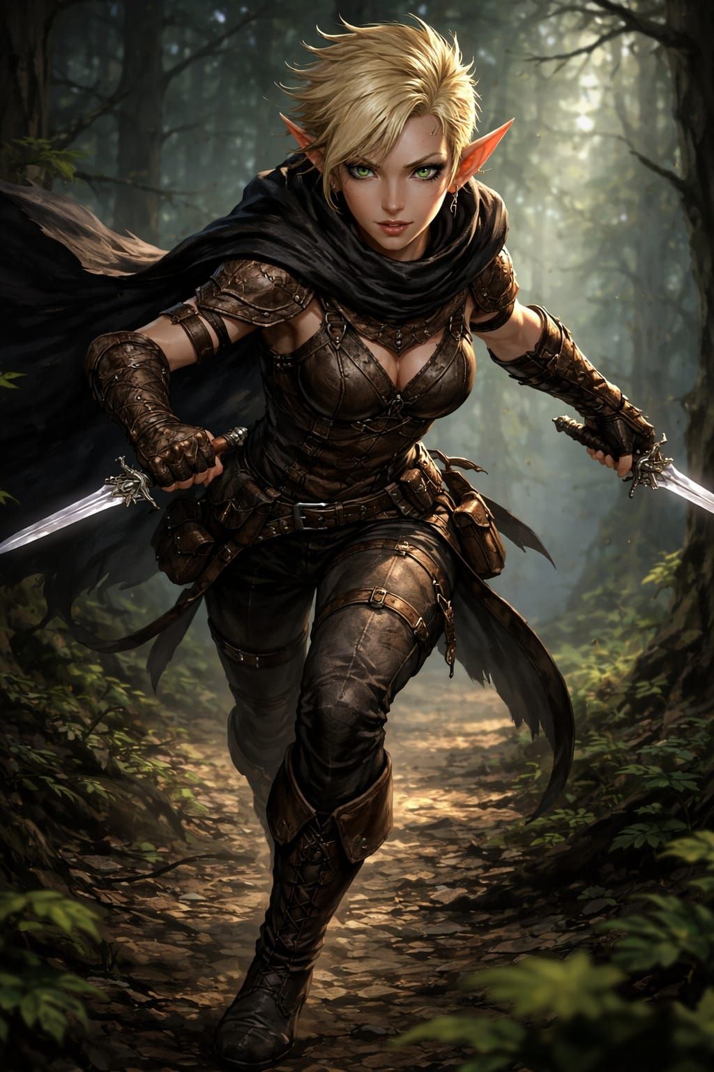 A 2D illustration of a petite elf rogue with blonde hair, wearing leather armor and a cloak, dual-wielding daggers as she charges through a dark forest. High fantasy magical realism style.