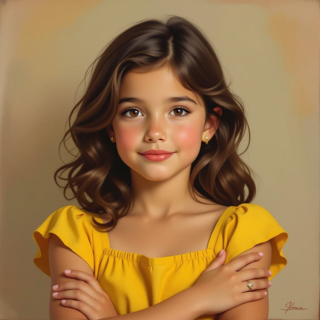 This image depicts a waist portrait of a young girl with brown hair and eyes, wearing a yellow sundress. Rendered in a classic oil painting style with impasto texture and soft lighting.