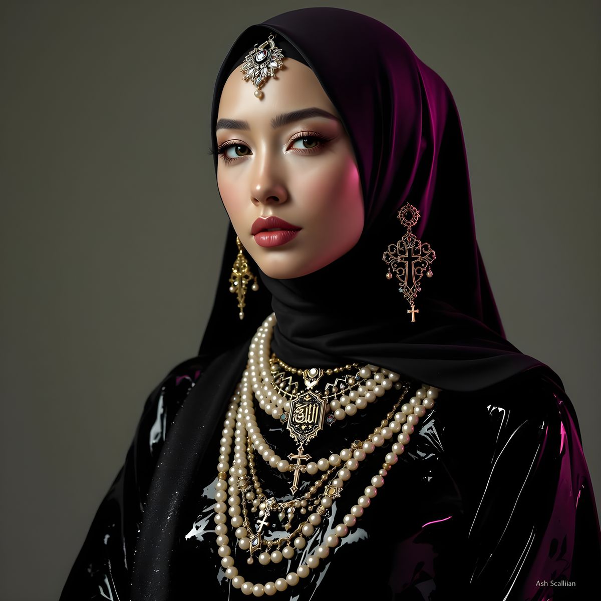 This image depicts a person wearing a hijab and latex clothing, adorned with a pearl body chain and jewelry. The subject's attire blends cultural and modern elements.