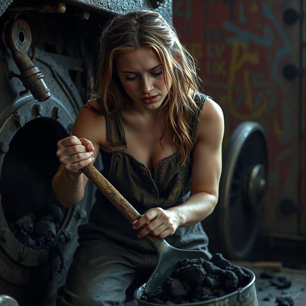 A hyperrealistic image of a young woman shoveling coal into a steam locomotive furnace. She is covered in soot with sweat dripping down her face, captured with dramatic lighting and intricate textures.