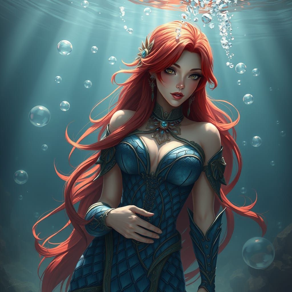 This enchanting image depicts a fantasy mermaid in a stunning underwater setting, surrounded by bubbles and soft light, exuding elegance and strength.