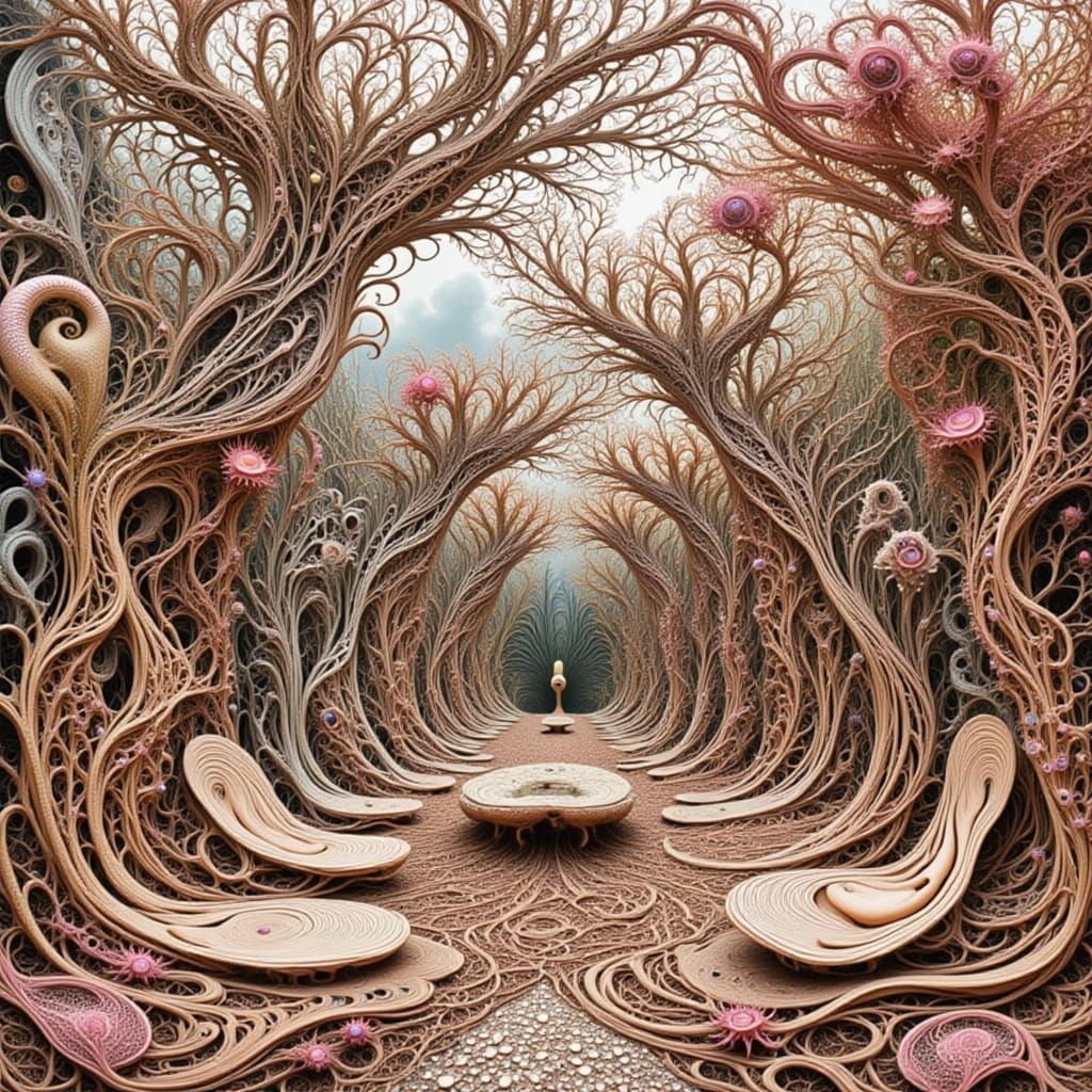 A photorealistic AI art vision of a gallery patio filled with unique, organically shaped sculptures with detailed tracery and filigree shadows, rendered in earthy tones with opalescent highlights.
