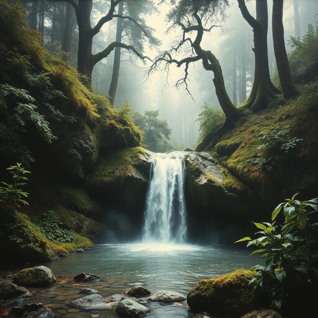 This enchanting oil painting captures the essence of a mystical forest, shrouded in a veil of ethereal mist. Soft light filters through the foliage, creating an atmosphere of mystery and wonder. A serene waterfall cascades gently, surrounded by delicate, dreamlike forms that invite the viewer to immerse ...