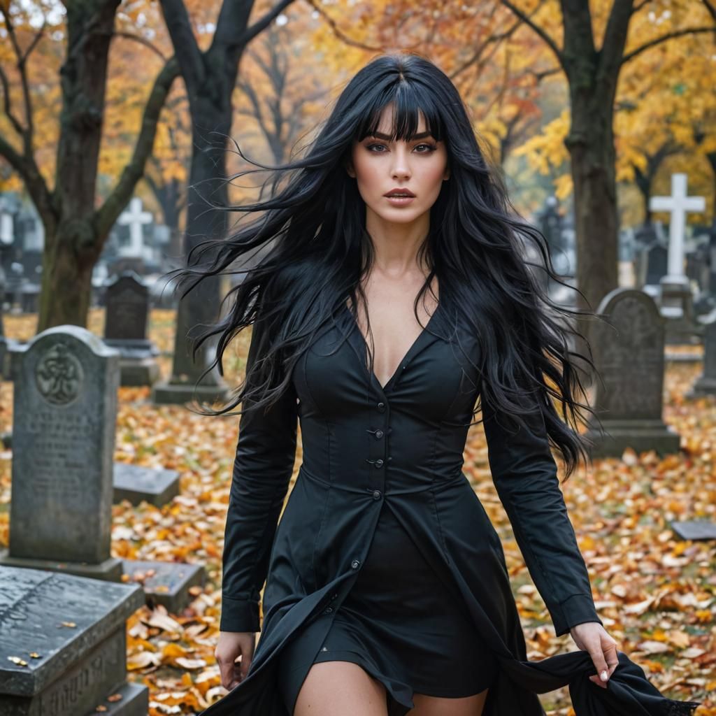 A striking picture of a woman with long black hair walking through a graveyard. The image features dynamic lighting and complementary colors to create a vivid scene.