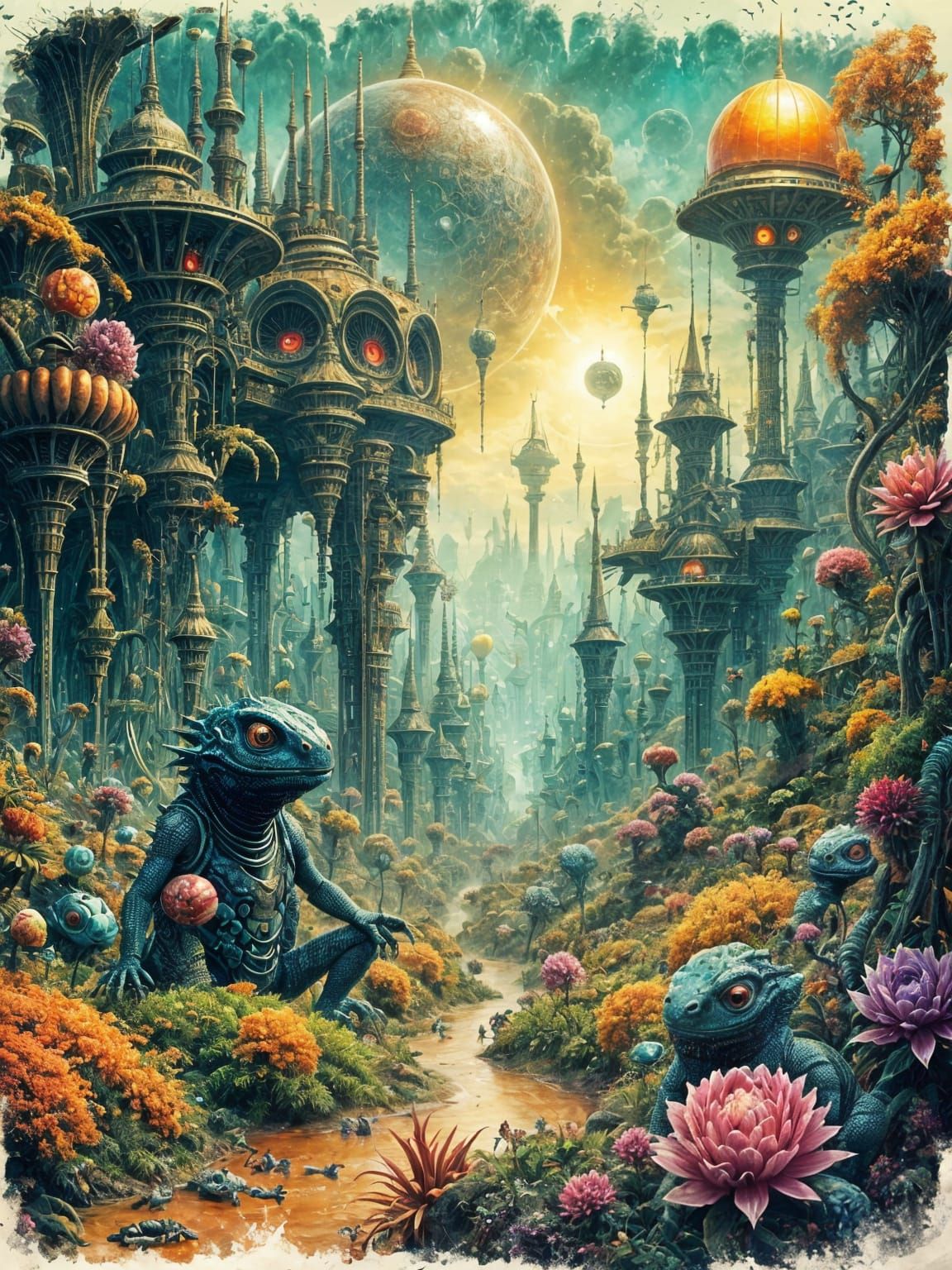 A striking picture of lizard people in a nanobot-filled landscape. This artwork features a blend of organic and sci-fi elements with ink-wash techniques, creating a morbidly cute scene with neon highlights.