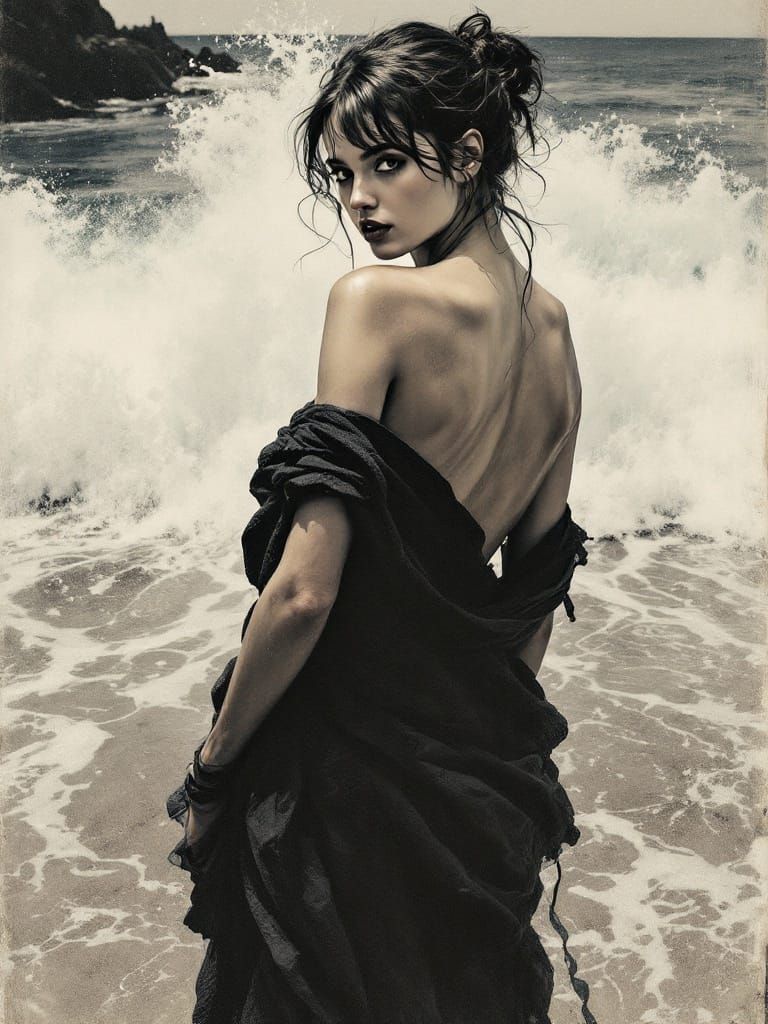 This image shows a woman standing on a beach, wrapped in a towel, with waves crashing behind her. The artwork combines Art Nouveau patterns with the blue-black impressions of carbon transfer, creating a unique and emotional piece.