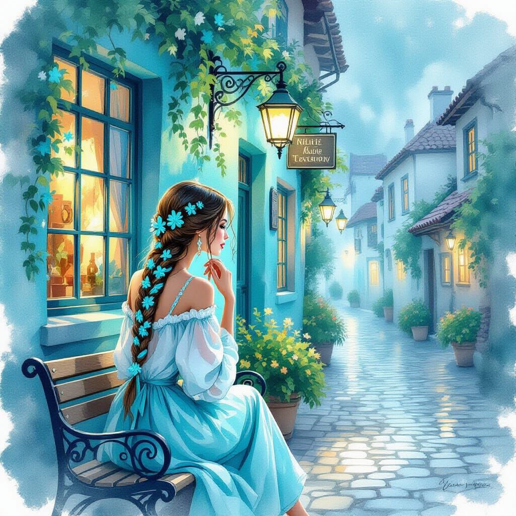 A nostalgic watercolor painting of a woman with turquoise hair and flowers on a cobblestone street. Soft light from a tavern creates a gentle, misty evening atmosphere.