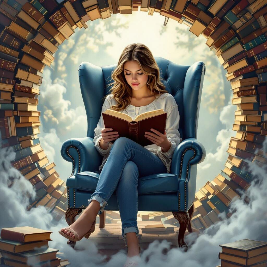A digital painting of a woman reading in a blue chair, surrounded by a swirling portal of books and mist. The image is highly detailed with soft, golden lighting, reminiscent of warm and inviting realism.