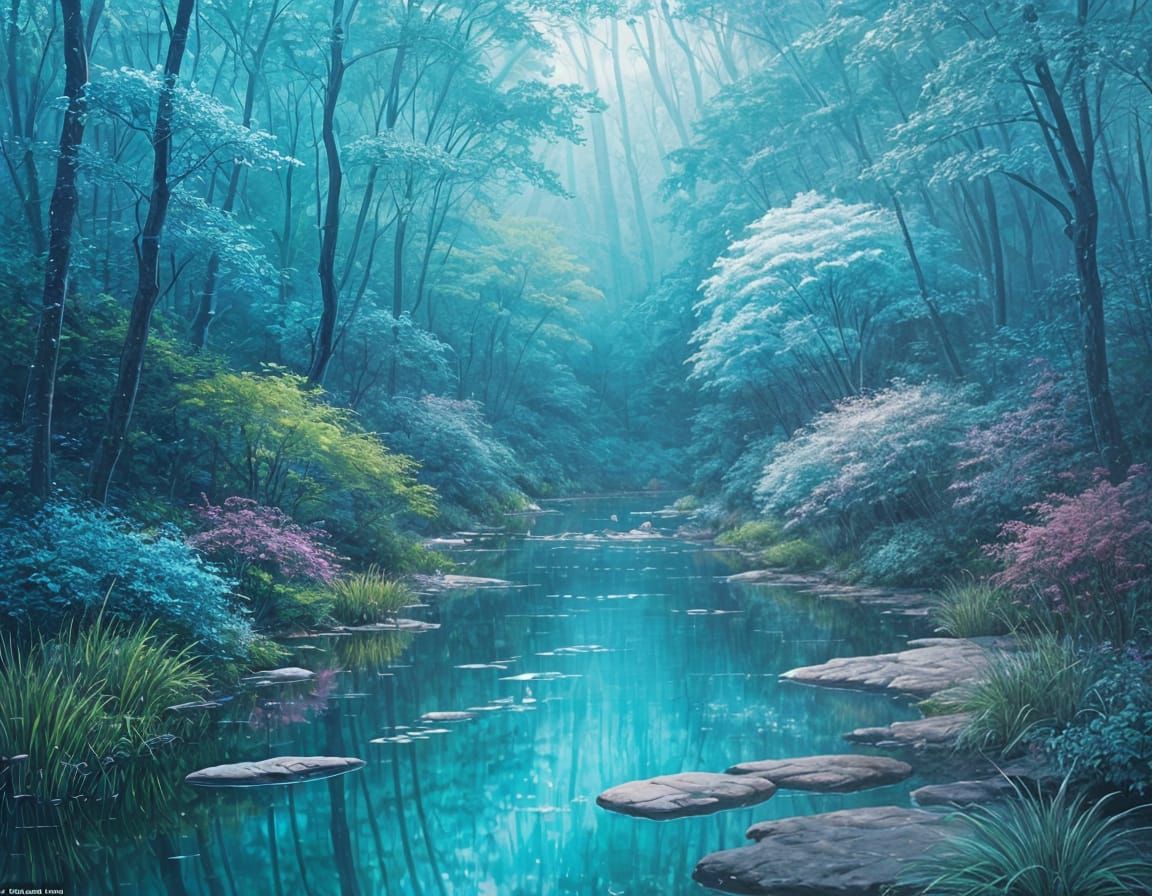 This image shows a kingfisher diving into a clear river within a magical forest filled with glowing flora. The scene captures a serene, enchanting mood with soft, blended colors.