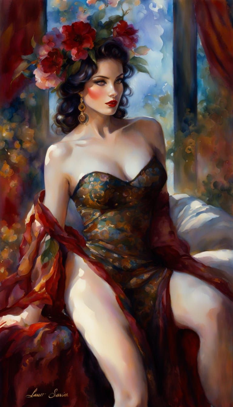 This image shows a pale-skinned Aphrodite posing against a floral background. The pin-up style art features elegant golden light and a soft focus, in a vibrant watercolor wash.