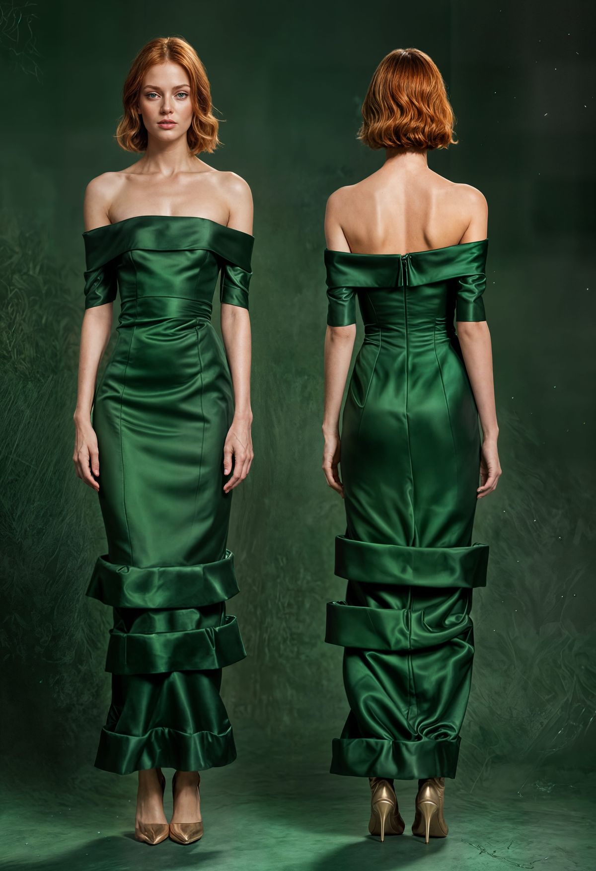 Redhead woman wearing a long, tight-fitting green satin dress, an unusual and elegant style (There is just one defect in the shoes).