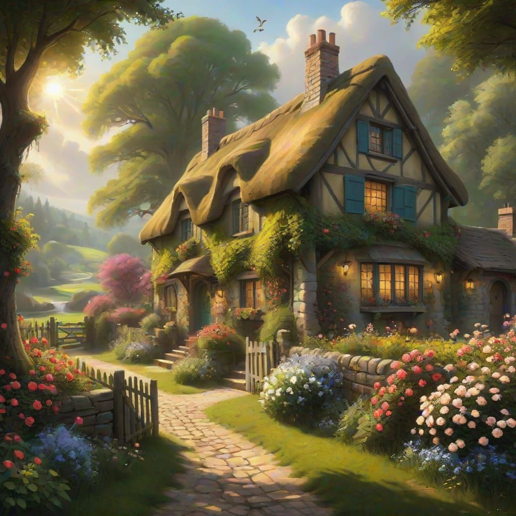 A picturesque cottage surrounded by a colorful flower garden. The walls are covered in climbing roses and a thatched roof sits overhead. The scene is rendered with vibrant colors, reminiscent of classic landscape paintings.