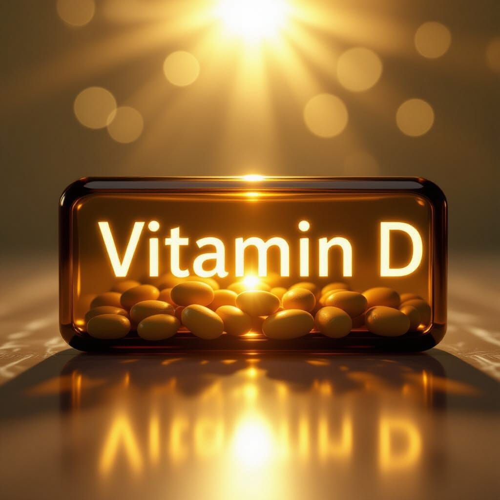 This image shows a sunbeam highlighting the "Vitamin D" label with a golden glow. Photorealistic macro photography with studio lighting and bokeh effects.