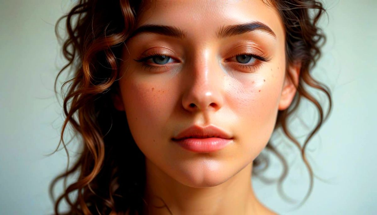 This image shows a woman's face with a pale complexion and closed eyes, creating a serene expression. Her hair is styled in loose curls cascading down her back, rendered in high definition.