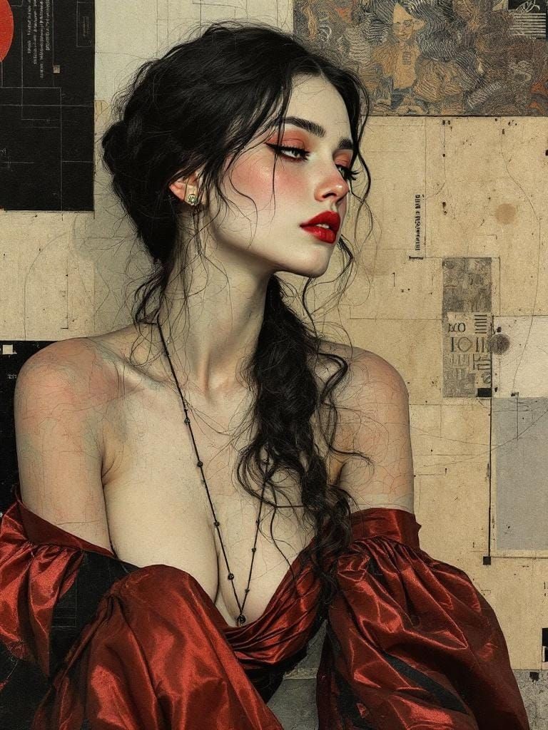 This image shows a full-body figure study of an Italian woman wearing a short metallic dress. The portraiture uses layered mixed-media depth and precise linework to create a sophisticated, introspective feel.