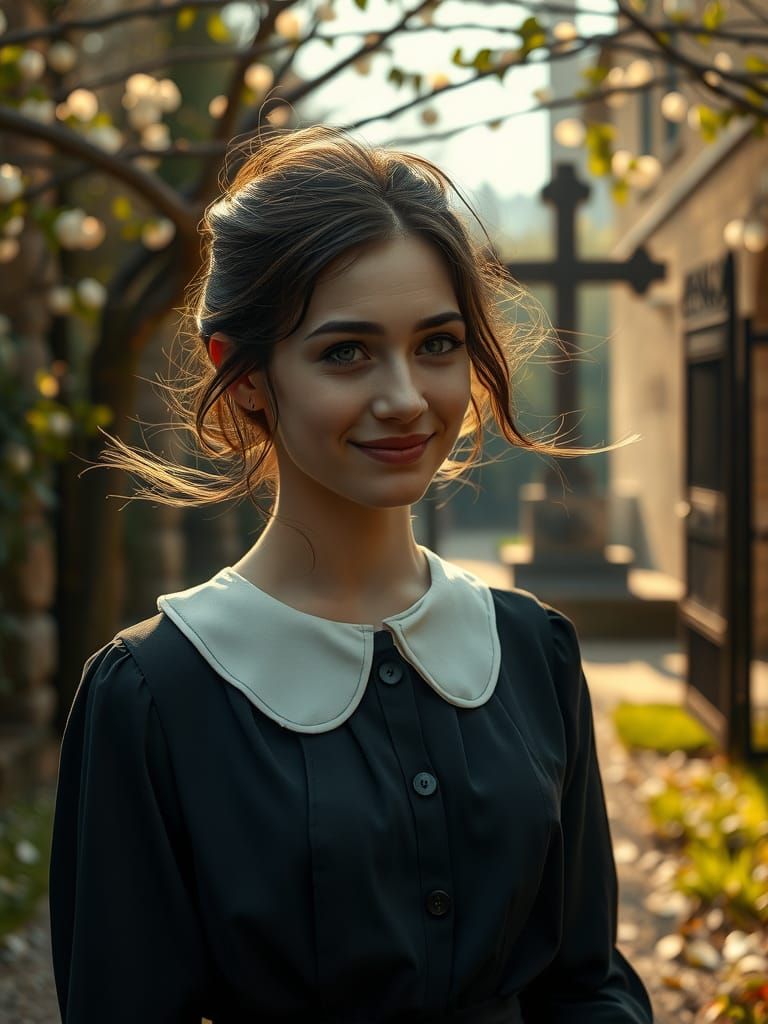 This image shows a young woman with a serene yet introspective expression, walking alone down a quiet spring alley. She wears a classic early 20th-century dress and has a gentle, sorrowful smile. Soft morning light and delicate petals create a serene atmosphere, while a subtle hint of melancholy is felt ...