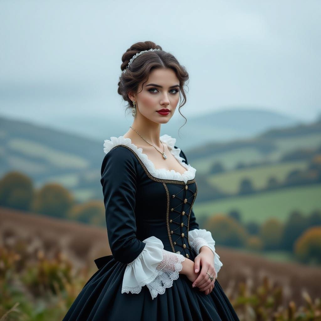 This image showcases Francia in elegant attire within a moody, atmospheric landscape. It features hyperrealistic detail, sharp focus, and high contrast, with a cinematic quality.