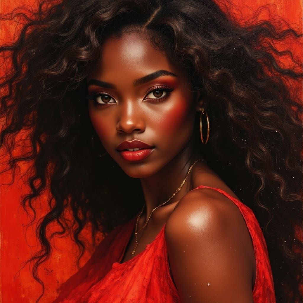 A hyperrealistic close-up portrait of a stunning African goddess in a red gown, featuring dramatic oil textures and cinematic lighting for a luminous effect.