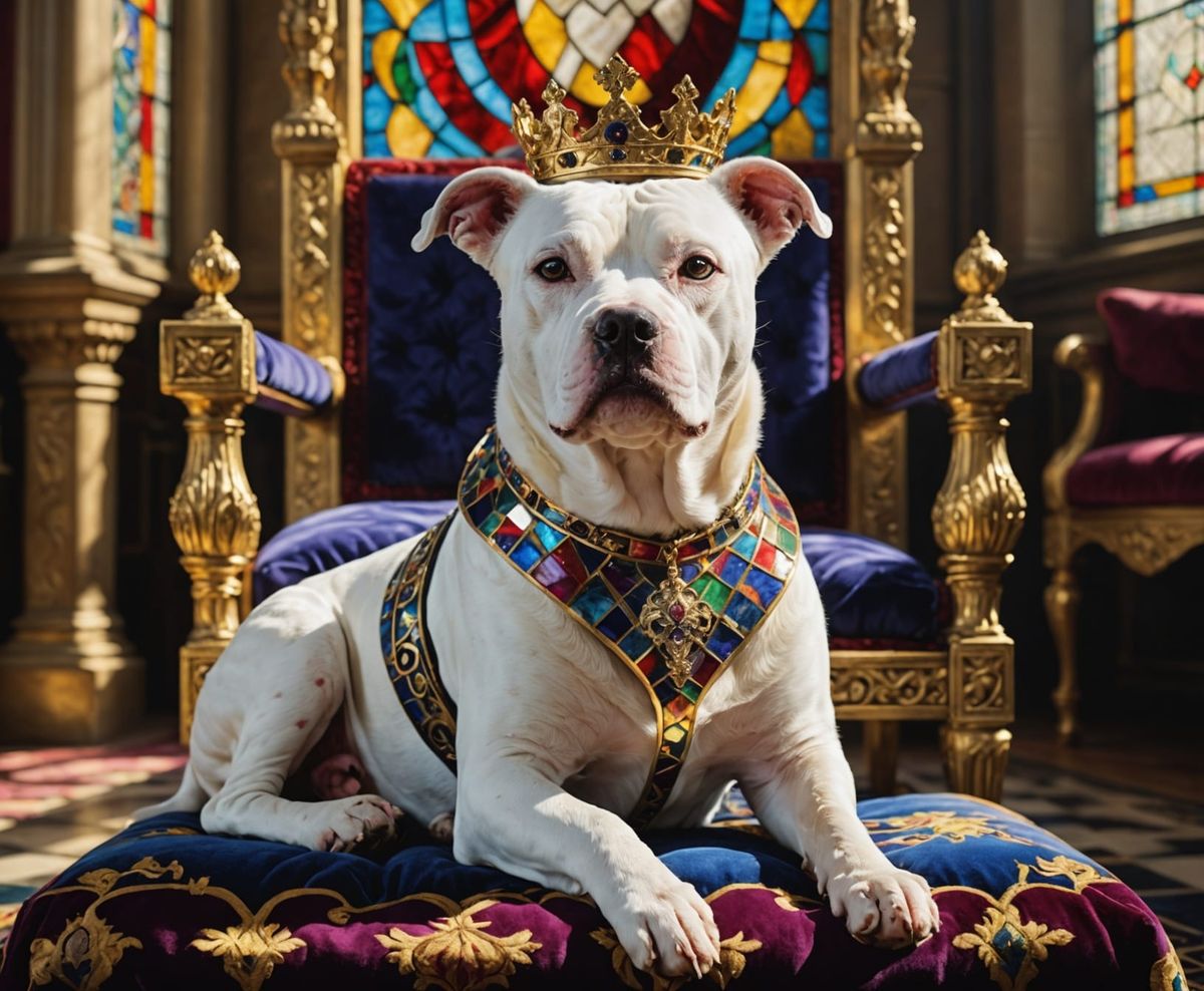 This image depicts a majestic dog, a Bull Arab mix, wearing a tiny crown and sitting on a lavish throne in a grand, baroque-style room. Sunlight streaming through stained-glass windows adds to the opulent atmosphere.