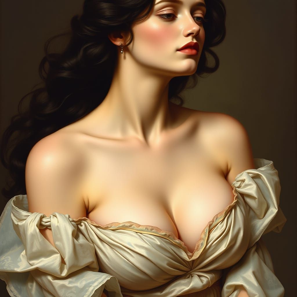 This image depicts a beautiful young woman with porcelain skin and flowing gown, rendered in the refined style of Raphael with delicate sfumato and chiaroscuro, evoking the ethereal beauty of the High Renaissance