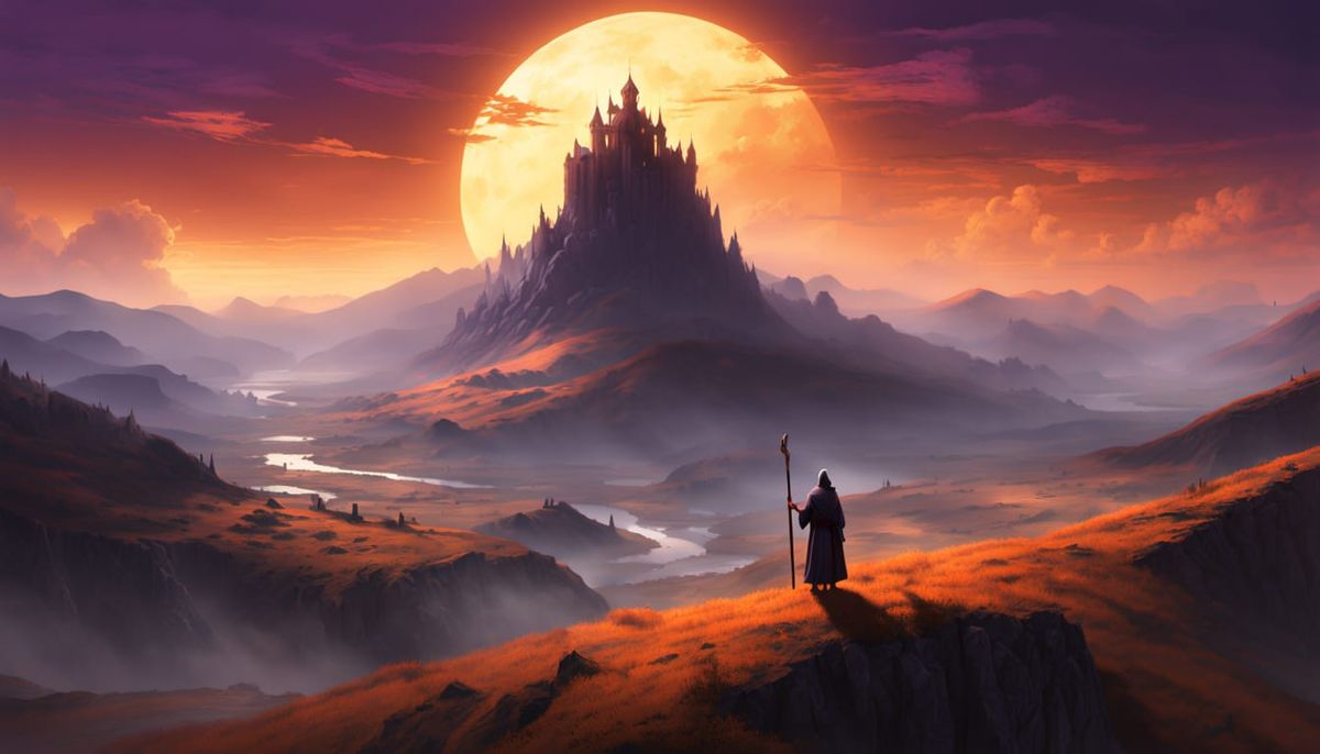 This digital painting shows a lone figure with a staff on a hill at sunset. Vivid colors and glowing accents create an epic fantasy landscape with atmospheric lighting.