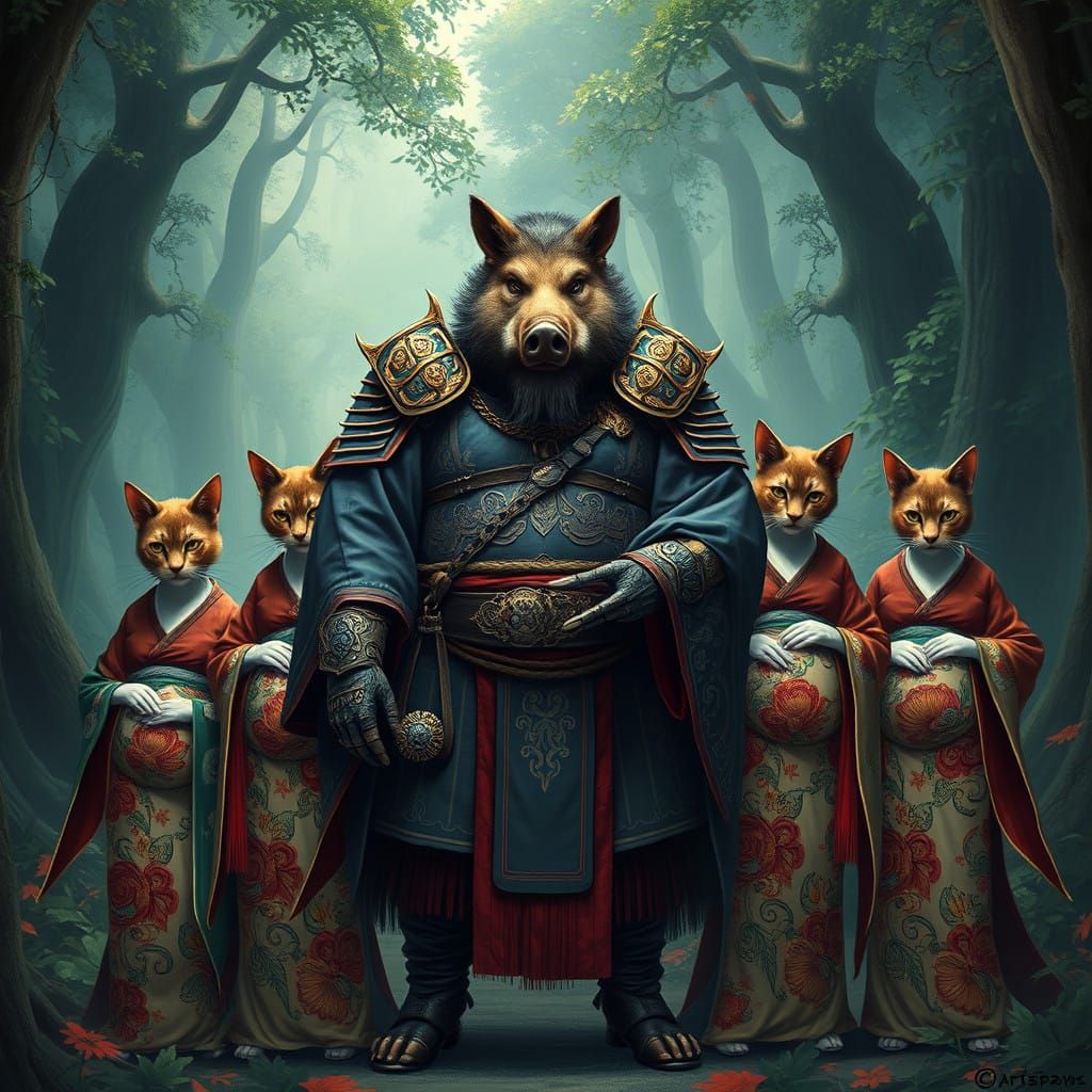 This enchanting painting features a powerful boar warlord surrounded by serene, expectant cat women in flowing kimonos, amidst a lush, mystical forest. Inspired by fantasy art and cinematic colors, the artwork exudes a sense of gentle, maternal warmth and depth, evoking a sense of 8K resolution quality.